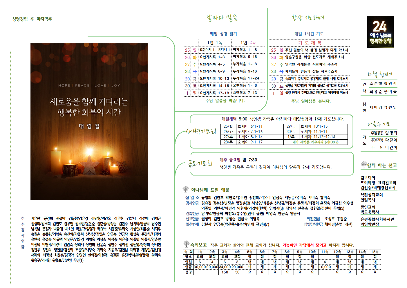 24년 11월 24일 주보 생명샘교회 댓글 0건 조회 659회 작성일 2024-11-24 07:36 가 본문내용 확대/축소 본문 24년 11월 24일 주보24년 11월 24일 주보 11월 넷째주 주보 목록 댓글목록 이전글24년 12월 1일 주보 24.12.01 다음글24년 11월 17일 주보24.11.17