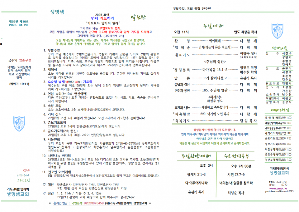 2025년 4월 20일 주보 생명샘교회 댓글 0건 조회 428회 작성일 2025-04-20 16:06 가 본문내용 확대/축소 본문 2025년 4월 20일 주보2025년 4월 20일 주보 4월 셋째주 주보 목록 댓글목록 이전글2025년 4월 27일 주보 25.04.28 다음글2025년 4월 13일 주보25.04.13