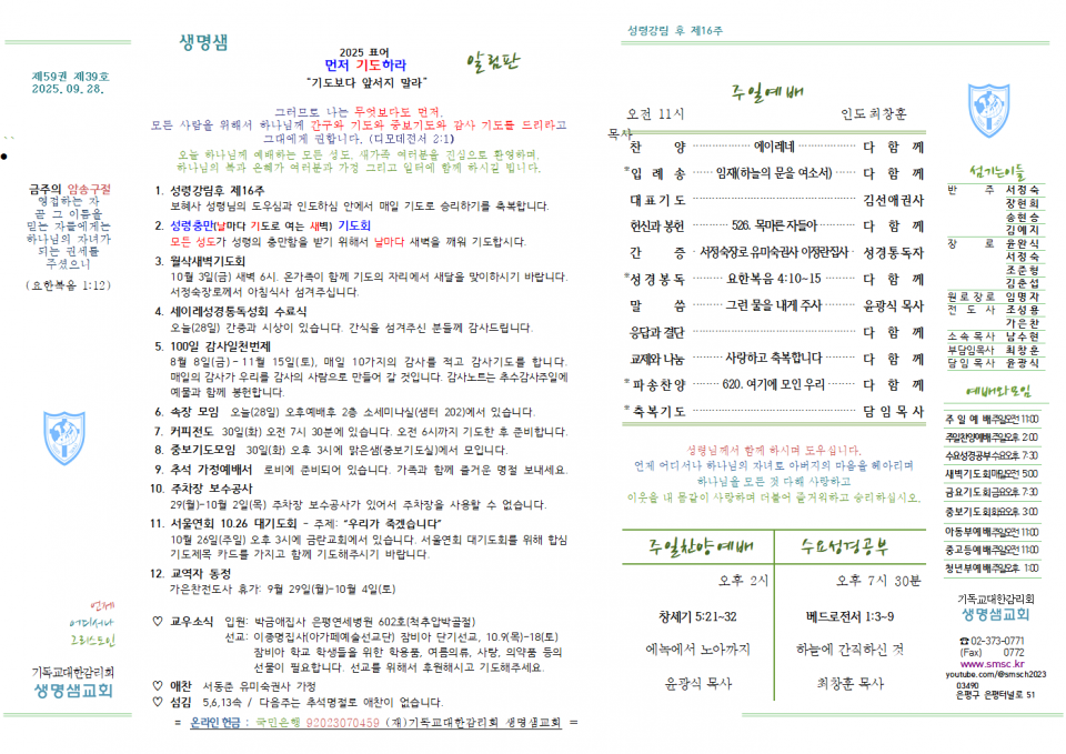 2025년 9월 28일 주보 생명샘교회 댓글 0건 조회 118회 작성일 2025-09-27 20:43 가 본문내용 확대/축소 본문 2025년 9월 28일 주보2025년 9월 28일 주보 9월 넷째주 주보 목록 댓글목록 이전글2025년 10월 05일 주보 25.10.04 다음글2025년 9월 21일 주보25.09.20
