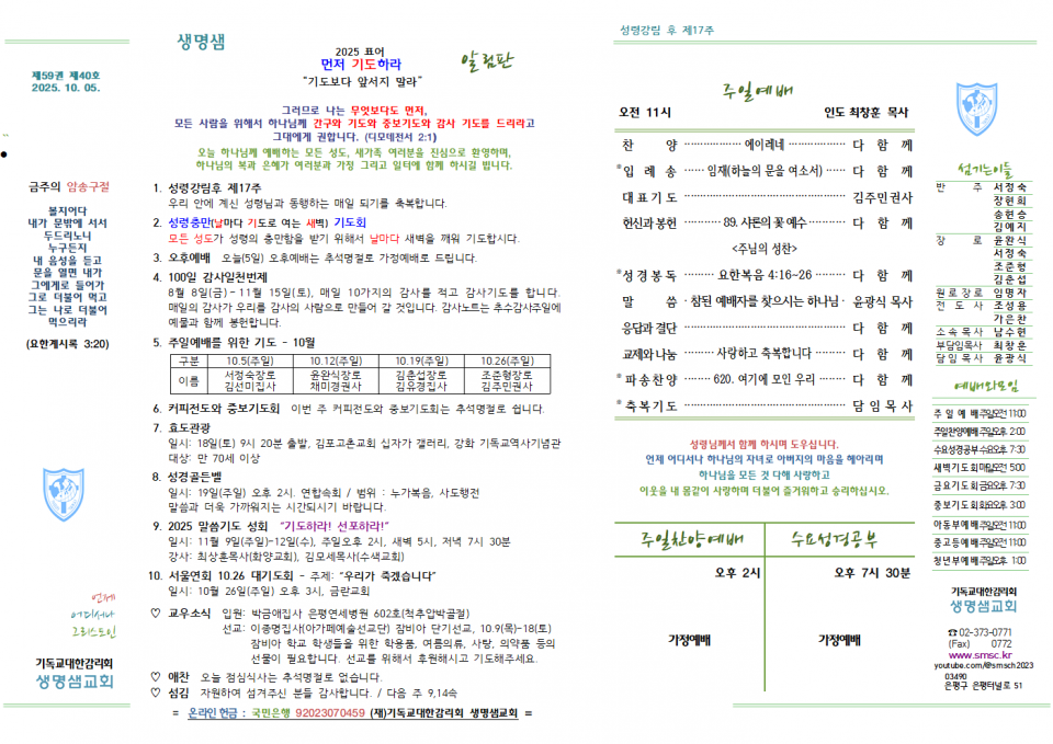 2025년 10월 05일 주보 생명샘교회 댓글 0건 조회 111회 작성일 2025-10-04 18:21 가 본문내용 확대/축소 본문 2025년 10월 05일 주보2025년 10월 05일 주보 10월 첫째주 주보 목록 댓글목록 이전글2025년 10월 12일 주보 25.10.11 다음글2025년 9월 28일 주보25.09.27
