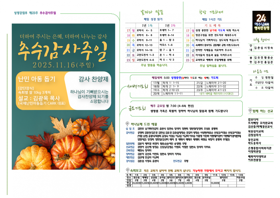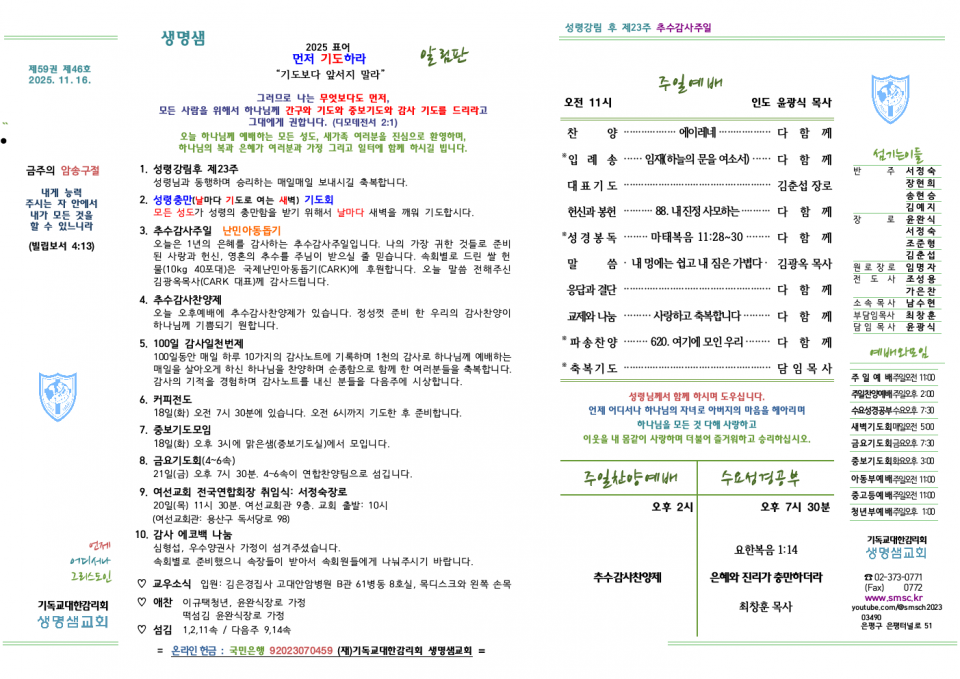 2025년 11월 16일 주보 생명샘교회 댓글 0건 조회 47회 작성일 2025-11-17 13:12 가 본문내용 확대/축소 본문 2025년 11월 16일 주보2025년 11월 16일 주보 11월 셋째주 주보 목록 댓글목록 이전글2025년 11월 23일 주보 25.11.23 다음글2025년 11월 9일 주보25.11.08