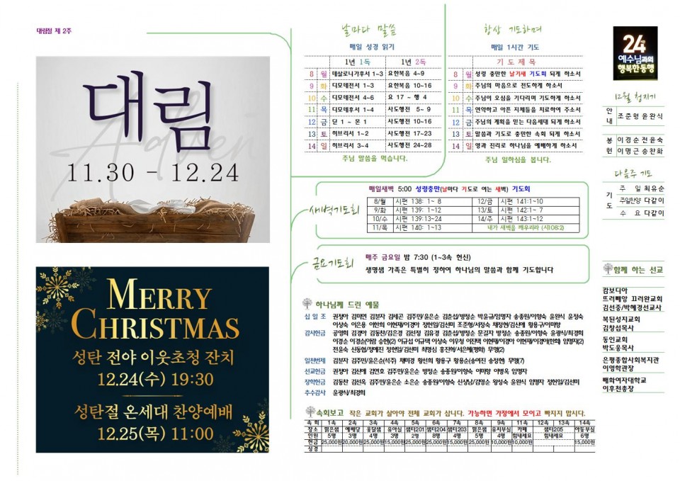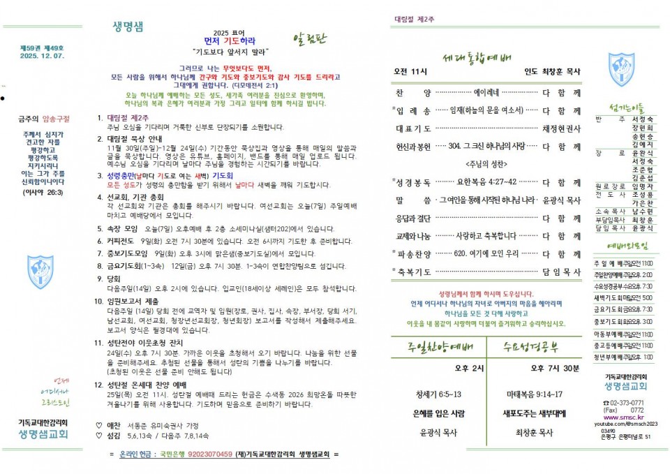 2025년 12월 7일 주보 생명샘교회 댓글 0건 조회 19회 작성일 2025-12-07 16:04 가 본문내용 확대/축소 본문 2025년 12월 7일 주보2025년 12월 7일 주보 12월 첫째주 주보 목록 댓글목록 이전글2025년 12월 14일 주보 25.12.15 다음글2025년 11월 30일 주보25.11.29