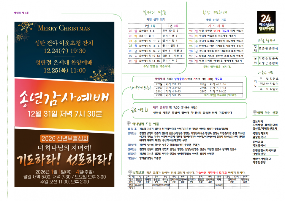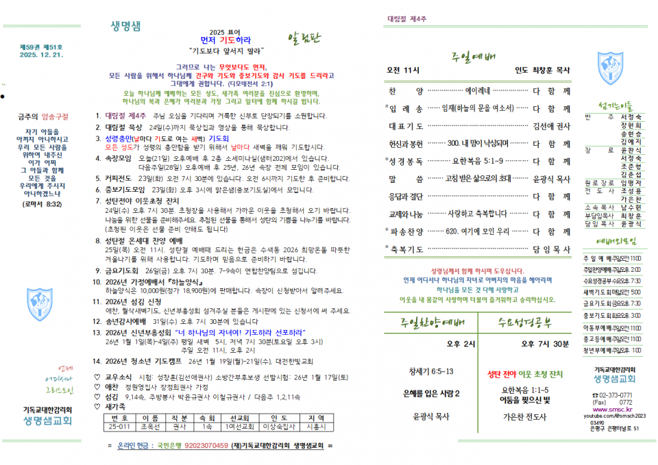 2025년 12월 21일 주보 생명샘교회 댓글 0건 조회 4회 작성일 2025-12-21 17:10 가 본문내용 확대/축소 본문 2025년 12월 21일 주보2025년 12월 21일 주보 12월 셋째주 주보 목록 댓글목록 다음글2025년 12월 14일 주보25.12.15